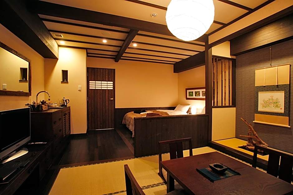 Room with a TV, a fridge and a shower room with amenities. It features a Japanese seating area with a tatami (woven-straw) floor, a low table and seating cushions. A personal safe, slippers and nightwear are provided.